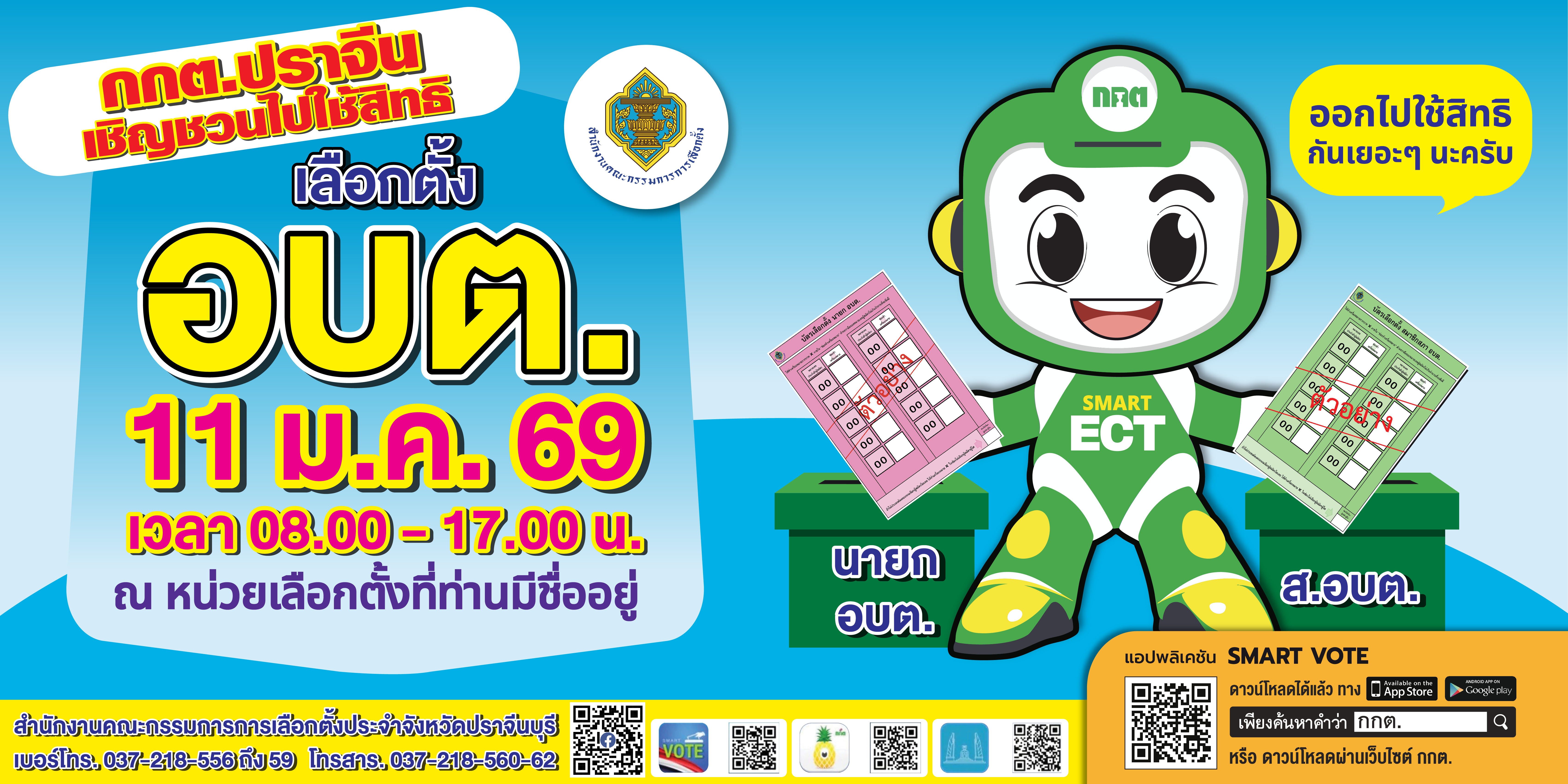 ขอเชิญชวนผู้มีสิทธิเลือกตั้ง ไปใช้สิทธิเลือกตั้งนายกองค์การบริหารส่วนตำบล และสมาชิกสภาองค์การบริหารส่วนตำบล ในวันอาทิตย์ที่ 11 มกราคม 2568 ตั้งแต่เวลา 08.00 น. - 17.00 น. ณ หน่วยเลือกตั้งที่ท่านมีชื่ออยู่