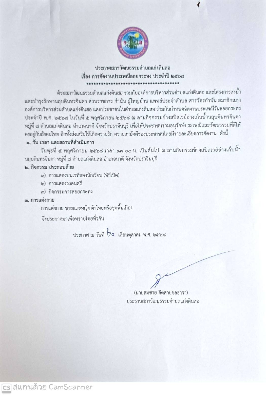 ประกาศจัดงานประเพณีวันลอยกระทง ประจำปี พ.ศ. 2568 |