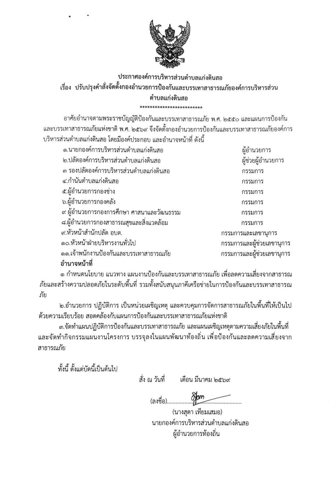 ประกาศ เรื่อง ปรับปรุงคำสั่งจัดตั้งกองอำนวยการป้องกันและบรรเทาสาธารณภัยองค์การบริหารส่วนตำบลแก่งดินสอ |