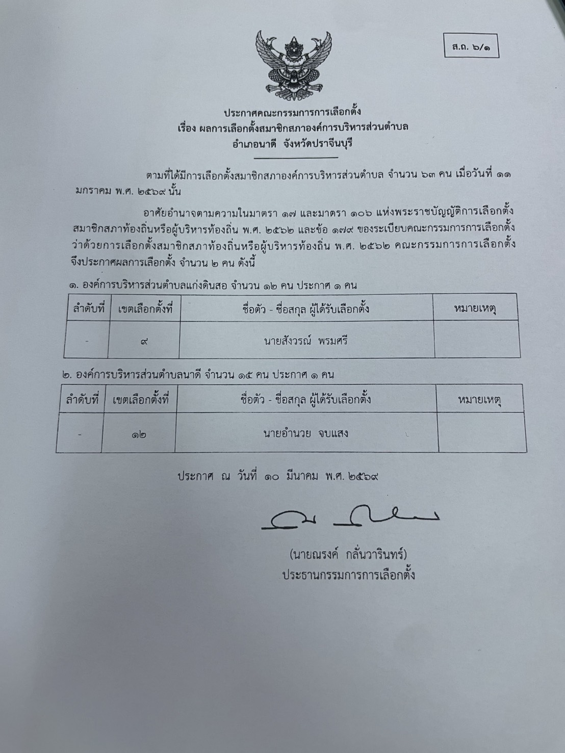 ประกาศผลการเลือกตั้งสมาชิกสภาองค์การบริหารส่วนตำบลแก่งดินสอ |